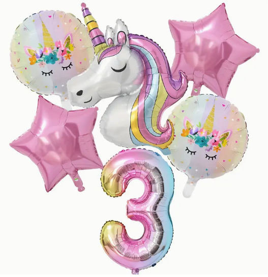Bring enchantment to your celebration with our 6-piece Rainbow Unicorn Balloon Set. This colorful collection features gradient number balloons (0–9 options), sparkling star-shaped aluminum foil balloons, and a beautifully printed unicorn design that’s perfect for birthday parties, anniversaries, New Year events, and more.