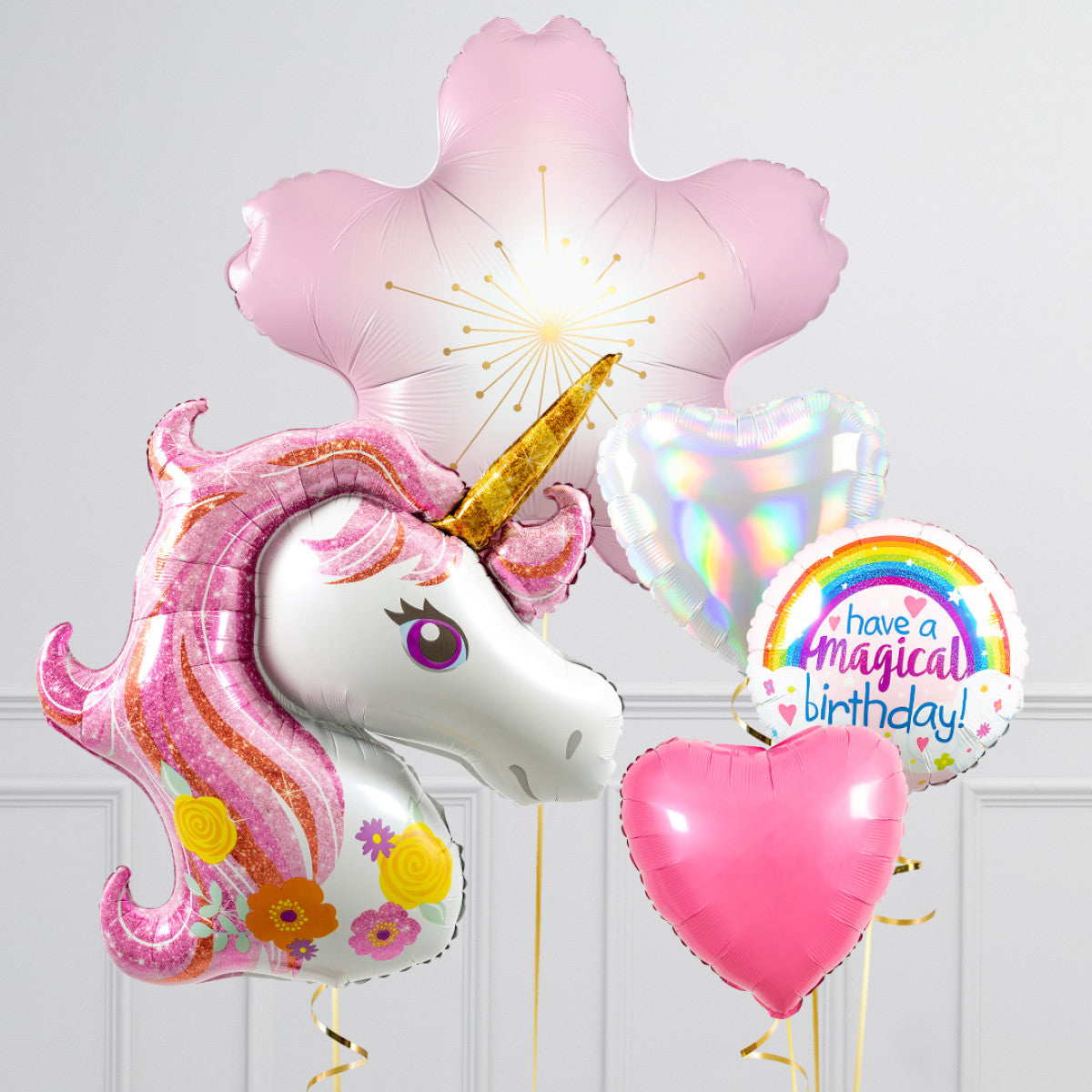 This enchanting helium-filled package comes with coordinating heart and circle foil balloons in dreamy pastel tones, plus a beautiful cherry blossom flower balloon to add extra sparkle. It arrives inflated with ribbon and weight, ready to surprise your little unicorn lover!